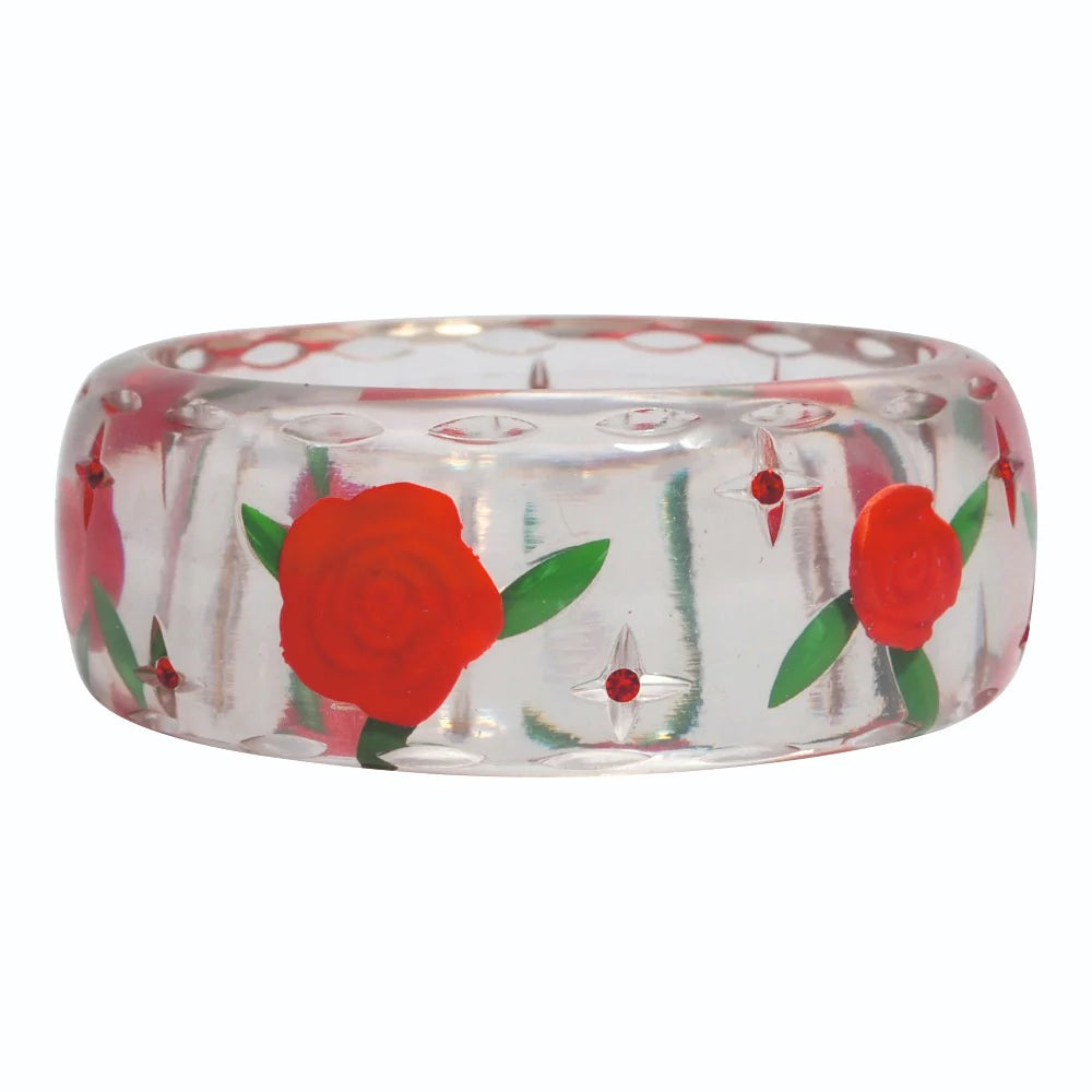 Le bracelet  Lover's Knot incarne le romantisme classique avec une touche vintage. La résine transparente révèle une rose rouge épanouie, agrémentée de feuilles sculptées à l'envers, de pierres précieuses colorées et de détails délicatement sculptés. Le bord festonné ajoute une touche d'élégance supplémentaire à ce bijou qui fera sensation.