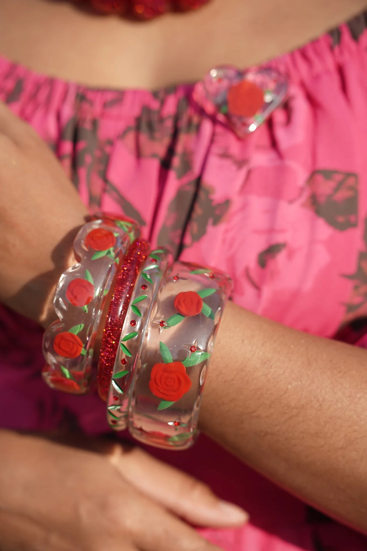 Le bracelet ondulé Lover's Knot incarne le romantisme classique avec une touche vintage. La résine transparente révèle une rose rouge épanouie, agrémentée de feuilles sculptées à l'envers et de détails délicatement sculptés. Le bord festonné ajoute une touche d'élégance supplémentaire à ce bijou qui fera sensation.
